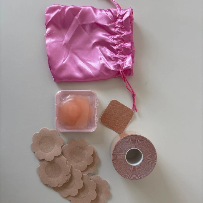 Il s’agit d’un kit comprenant une bande adhésive, des caches-tétons en silicone réutilisables, des protections supplémentaires et des accessoires de rangement.