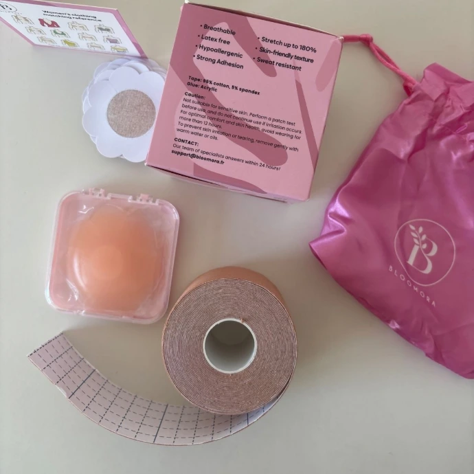 Le produit Bloomora est présenté comme un ensemble de bande adhésive pour la poitrine avec accessoires, destiné à offrir un soutien invisible, un effet lift, un confort prolongé et une bonne tenue, y compris en conditions actives. Le protocole SaferBuy vise à vérifier dans quelle mesure ces éléments sont cohérents avec le produit réellement reçu.