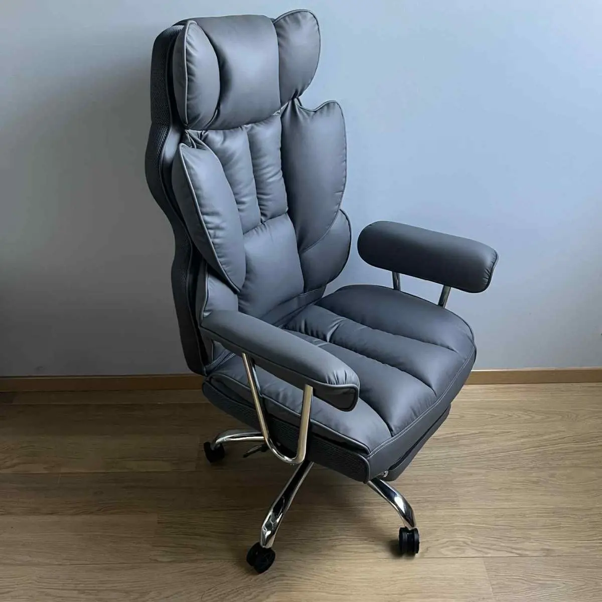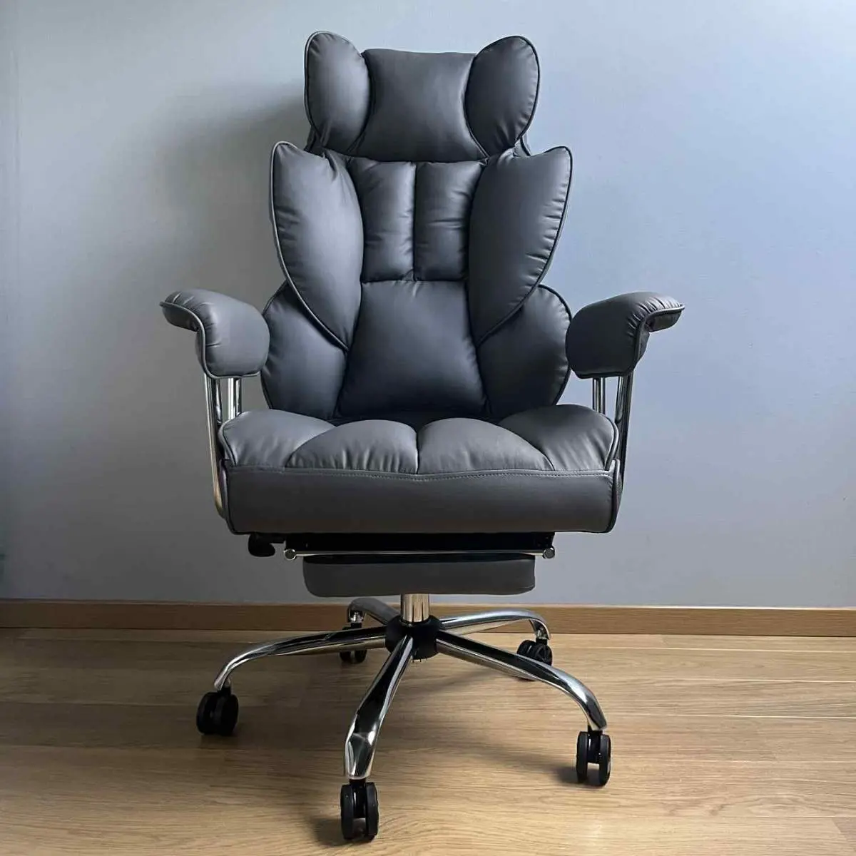 Ce modèle est décrit comme une chaise ergonomique en cuir PU, conçue pour supporter jusqu’à 200 kg, équipée d’un repose-pieds intégré, d’un dossier haut et d’un soutien lombaire renforcé.