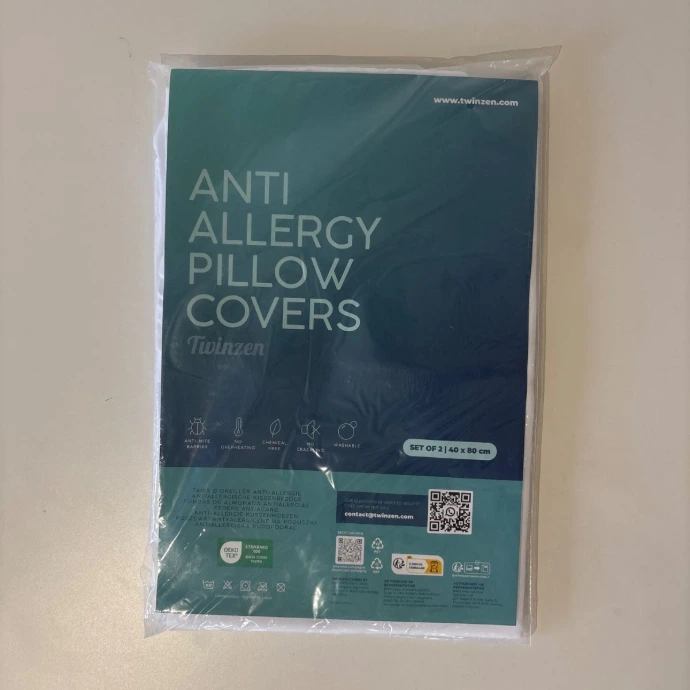 Cet article est présenté comme un lot de 2 housses d’oreiller anti-acariens en taille 40 x 80 cm, avec fermeture sécurisée, lavage en machine jusqu’à 95°C, certification OEKO-TEX et promesses de confort textile.