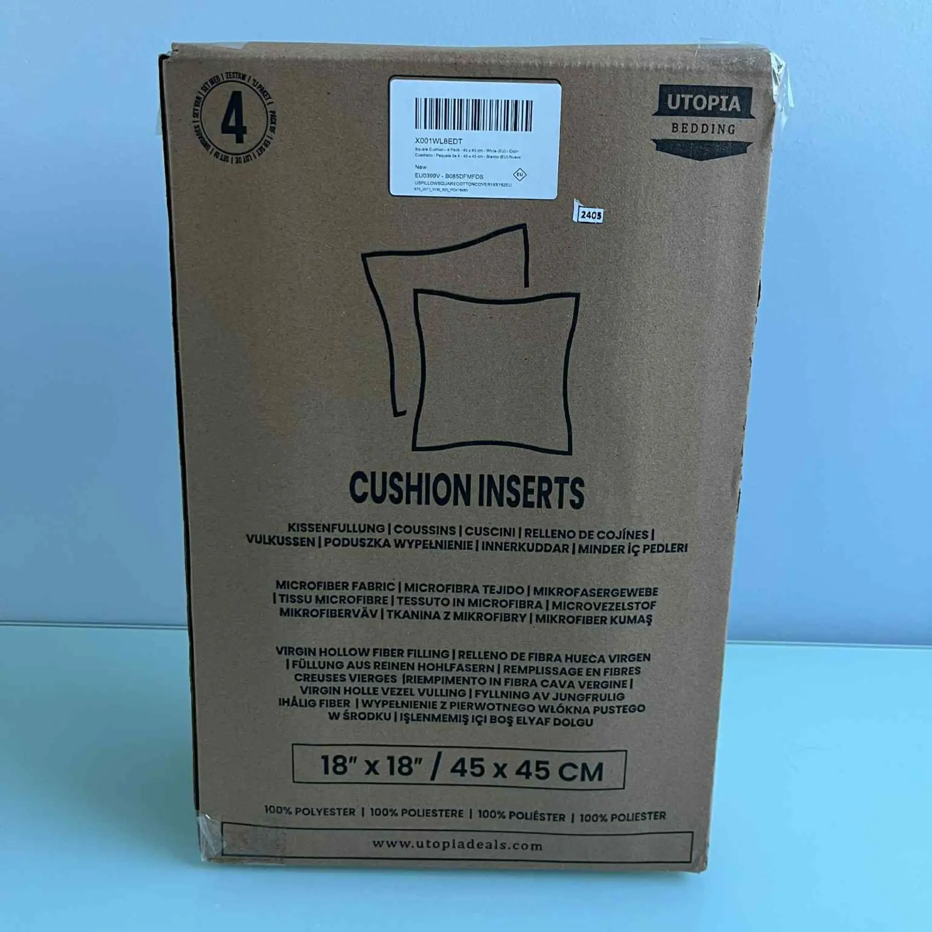 Nous avons effectué un achat anonyme de ce lot de 4 coussins de garnissage (en blanc 45x45cm) de la marque Utopia Deals sur Amazon. En tant qu'institut de test indépendant, nous avons évalué ce produit avec soin, de la commande à l'utilisation.