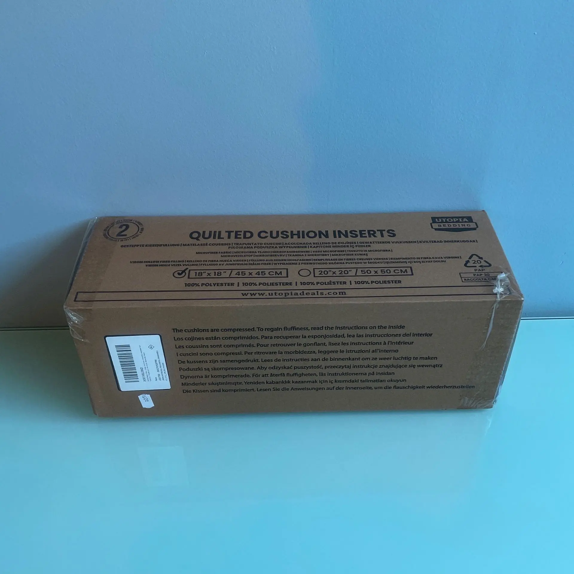 Nous avons effectué un achat anonyme de ce lot de 2 coussins matelassés (en blanc 45x45cm) de la marque Utopia Deals sur Amazon France. En tant qu'institut de test indépendant, nous avons évalué ce produit avec soin, de la commande à l'utilisation.