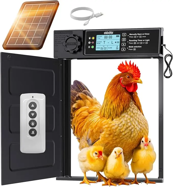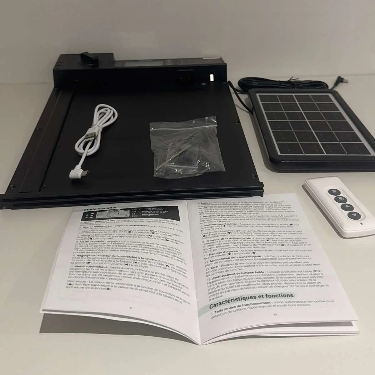 Cette porte automatique solaire est présentée comme une solution pratique, durable et sécurisée pour protéger les volailles. Elle combine panneau solaire, batterie intégrée 2000 mAh, minuterie, télécommande et capteur de lumière permettant l’ouverture et la fermeture en fonction du lever/coucher du soleil.
